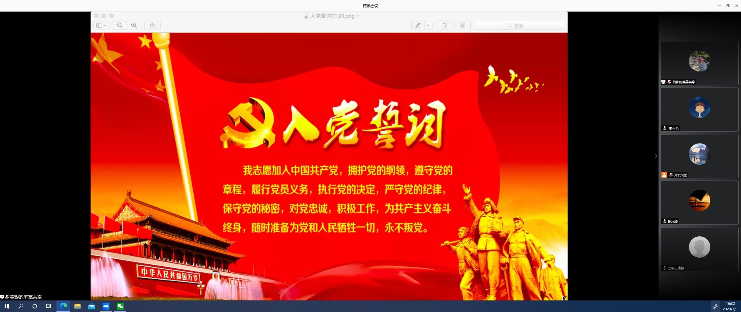 李楠明、赵海峰、于跃三名同志分别代表学院老中青三代共产党员回顾了入党历程,表达了对党的敬仰与热爱,将继续在学院未来事业的发展当中坚守入党初心,发挥党员模范作用。随后,全体党员在优秀党务工作者王秋同志的带领下共同重温了入党誓词。