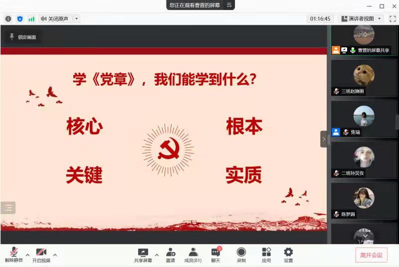 首先,曹萱学长带领同学们了解了《中国共产党章程》的完善发展历程及重要地位。他指出,《中国共产党章程》是中国共产党为实现党的纲领、规定党内事务的根本法规,是党的各级组织和全体党员必须遵守的基本准则和规定,具有最高党法、根本大法的效力。因此,学习《中国共产党章程》是十分重要且必要的。