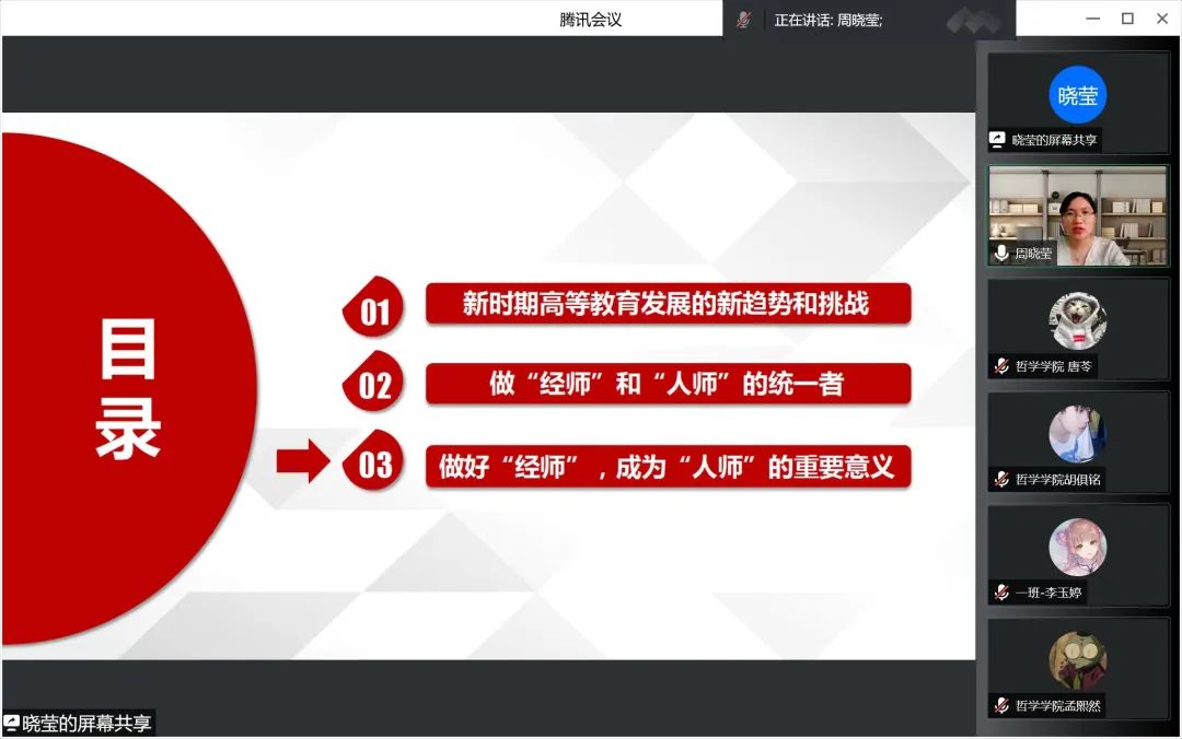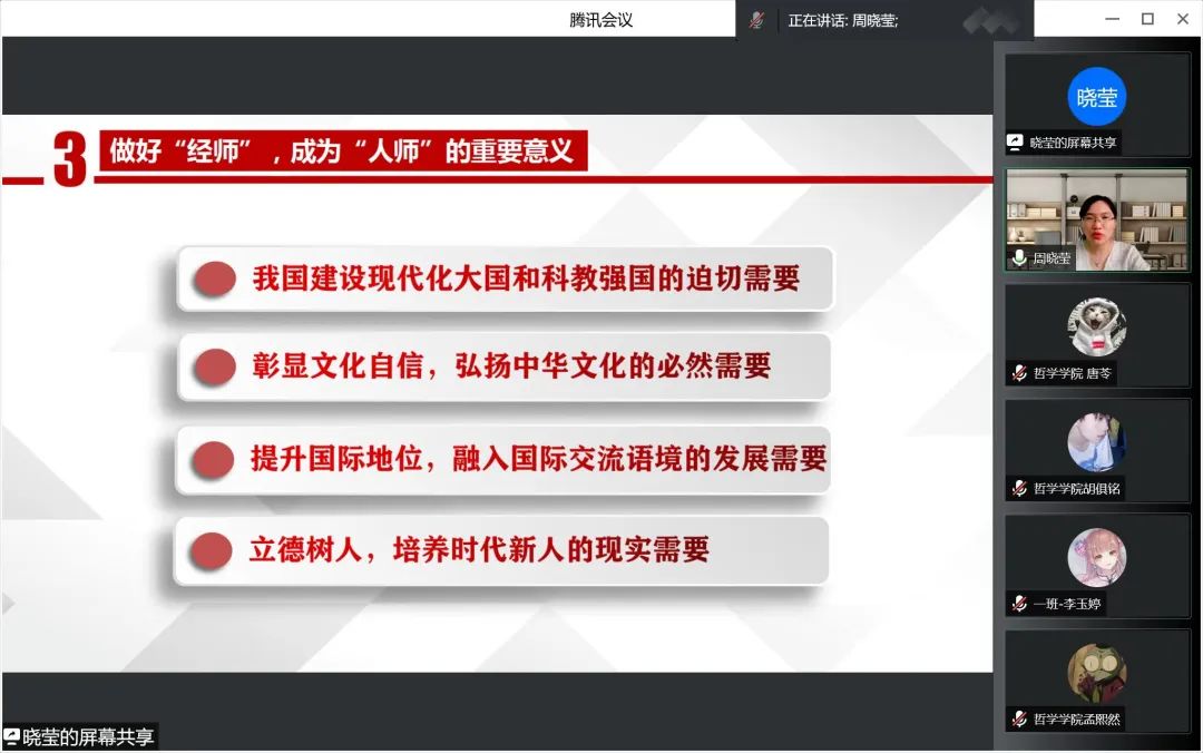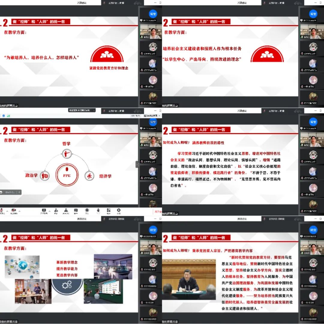 习近平总书记强调,好的学校特色各不相同,但有一个共同特点,都有一支优秀教师队伍。对教师来说,培养社会主义建设者和接班人,迫切需要我们的教师既精通专业知识、做好“经师”,又涵养德行、成为“人师”,努力做精于“传道授业解惑”的“经师”和“人师”的统一者。周晓莹老师从三方面讲述如何做好“经师”,成为“人师”。