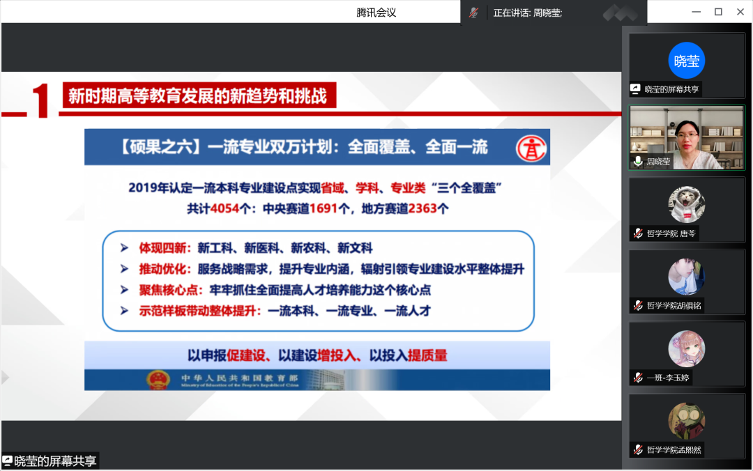 第一,新时期高等教育发展的新趋势和挑战。在新全球化背景下,出现了两极对峙和新技术革命等一系列问题与挑战。在两极对峙中,冲突阵营之间的学生流动和学术交流,尤其是涉及核心技术和敏感领域的知识生产和学术交流明显下滑。新技术革命在线教育正在从虚拟走向现实、从虚体变成实体、从辅助变成必需,未来将更加深刻地影响高等教育的发展。面对新全球化的发展格局,教育部强力推进课程思政建设,启动了“六卓越一拔尖”计划2.0,全面推进新型工科、新医科、新农科、新文科建设,面向所有高校、所有专业,全面实施一流专业建设“双万计划”。党的十九大报告明确提出,新时代高等教育的任务是实现内涵式发展,而培养一流人才就是内涵式发展的最核心标准。