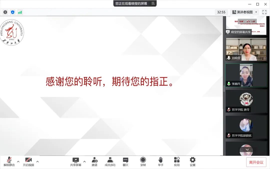 精彩的讲座结束后,张丽丹老师指出,“感谢周老师为大家带来精彩且意义重大的讲座,周老师用生动详实的案例,使我们进一步理解习近平总书记重要讲话精神。我们应从自身做起,坚持理想信念,勇于砥砺奋斗,明确世界大局与中国特色,注重优秀传统文化的继承与发展,用习近平新时代中国特色社会主义思想武装头脑。”