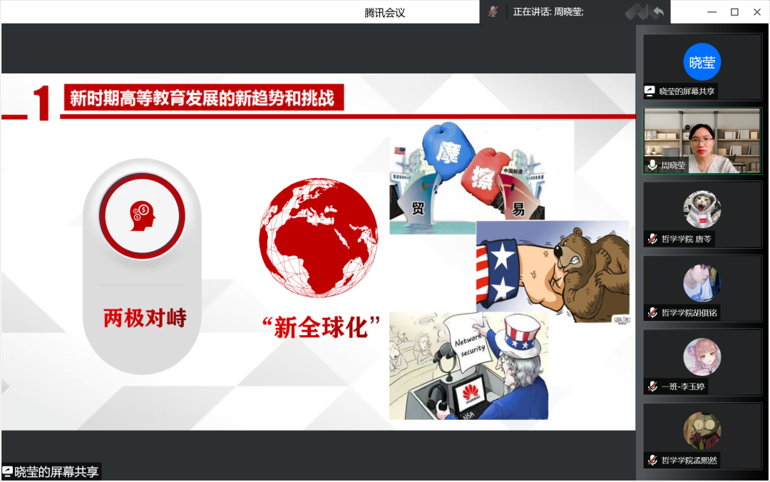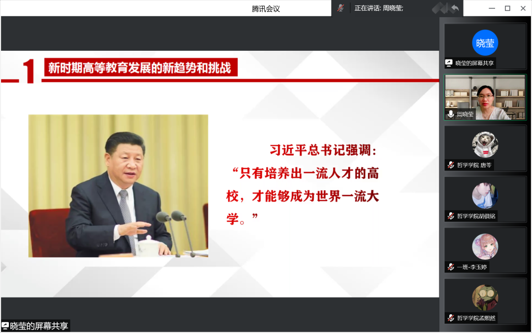 为深入贯彻党的十九届六中全会精神,领悟习近平新时代中国特色社会主义思想,深入解读习近平总书记在中国人民大学考察时的重要讲话精神,yl6809永利官网集团于2022年6月15日线上开展做好“经师”,成为“人师”——习近平总书记在中国人民大学考察时的重要讲话精神解读讲座,yl6809永利官网集团周晓莹老师担任此次讲座主讲人,党总支副书记张丽丹老师主持会议,组织员吴红英老师、正处级辅导员孙庆斌老师、团委书记张博伦老师、团委副书记焦瑞老师出席讲座,哲院学院全体党员、预备党员及入党积极分子参加讲座。