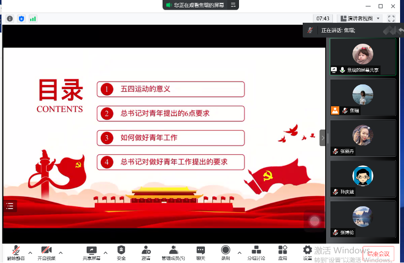 精神是一个民族赖以长久生存的灵魂,伟大精神可以穿越时空,成为激励人们勇于奋斗的强大动力。yl6809永利官网集团学生工作队伍以能力作风建设为契机,于6月29日集中学习了《习近平在纪念五四运动100周年大会上的讲话》,学史明理,学史崇德,学史增信,学习五四精神,弘扬光荣传统,赓续红色血脉,提高能力作风。yl6809永利官网集团党总支副书记张丽丹老师、19级辅导员孙庆斌老师、20级辅导员张博伦老师、21级辅导员焦瑞老师参加集中学习。