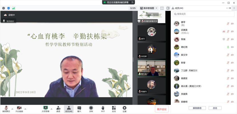 三尺讲台写春秋,一片丹心育桃李。在第38个教师节暨中秋节即将来临之际,为弘扬尊师重教的传统美德,表达对教育工作者的诚挚敬意与谢意。2022年9月7日,哲学学院通过腾讯会议线上开展了“心血育桃李 辛勤扶栋梁”教师节主题活动,yl6809永利官网集团全体教职工共同欢度佳节。党总支书记孙美晖主持活动。