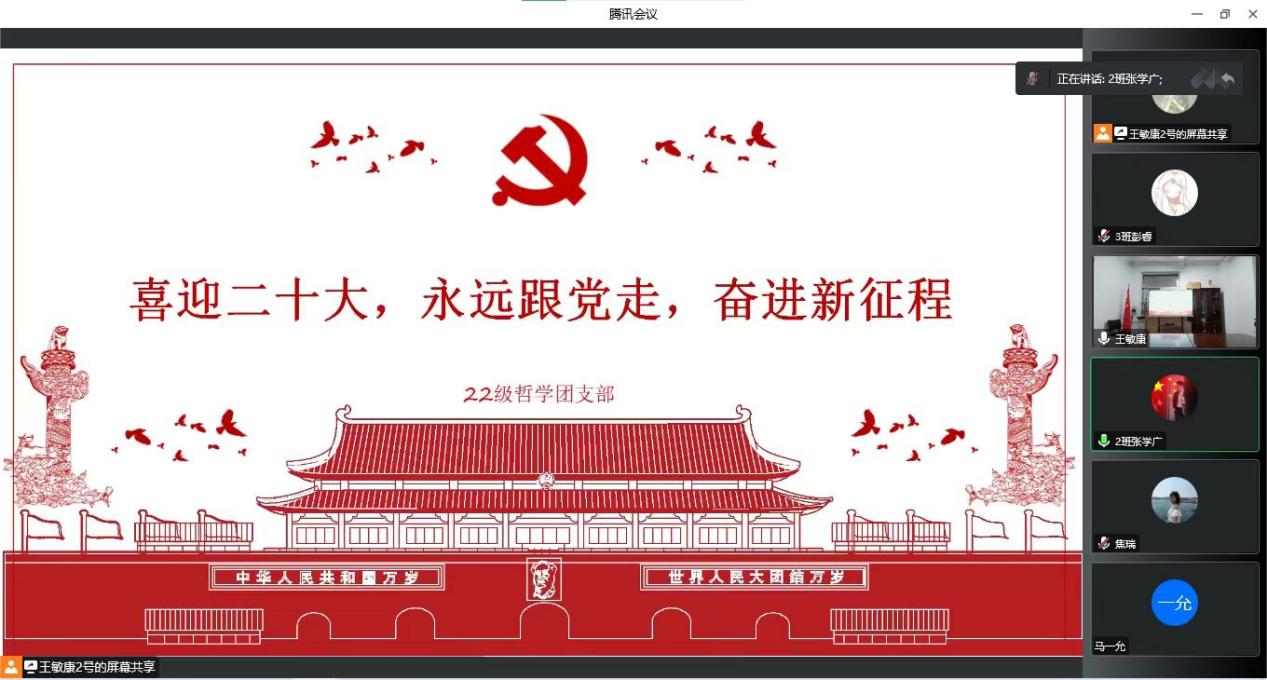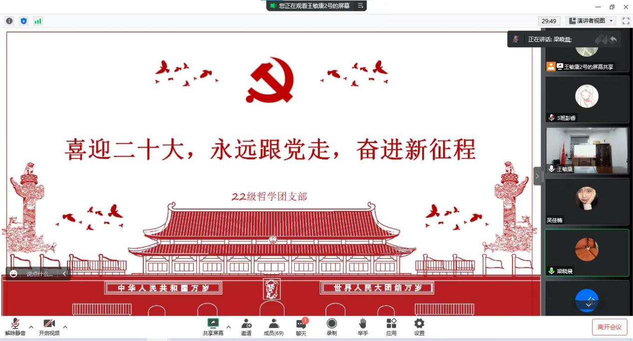 本次团日活动首先由姜锦洋、曹锋两位学生主持人带领大家重温建党百年的伟大精神,让同学们对本次学习二十大精神有了更深刻的体会,更好的理解了中国共产党伟大精神的丰富内涵。接下来伴随着轻快的音乐声响起,全体同学共同观看了由韩泽铭同学剪辑的进入yl6809永利集团以来的生活,让同学们更加深刻地感受到了在黑大、在哲院的温馨,回忆起了在短短几个月之间的我们的欢声笑语和疫情之下的守望相助。