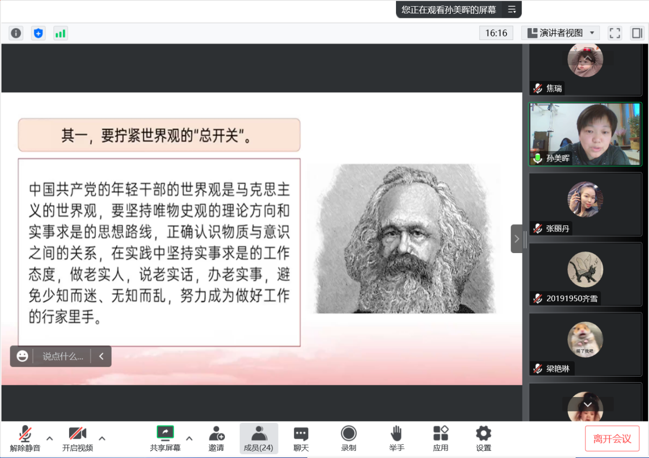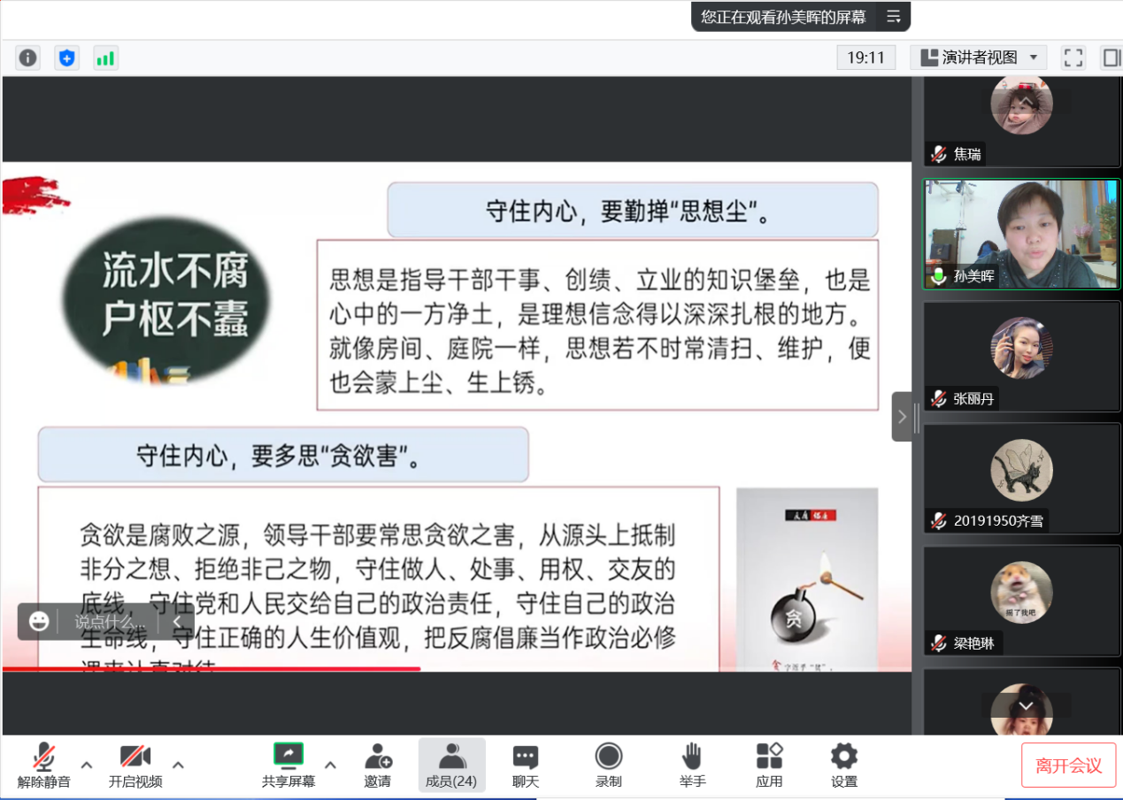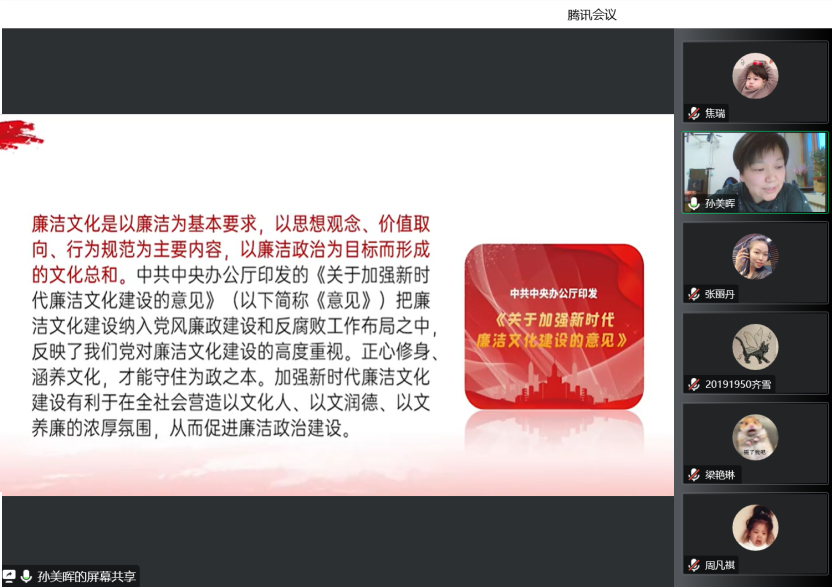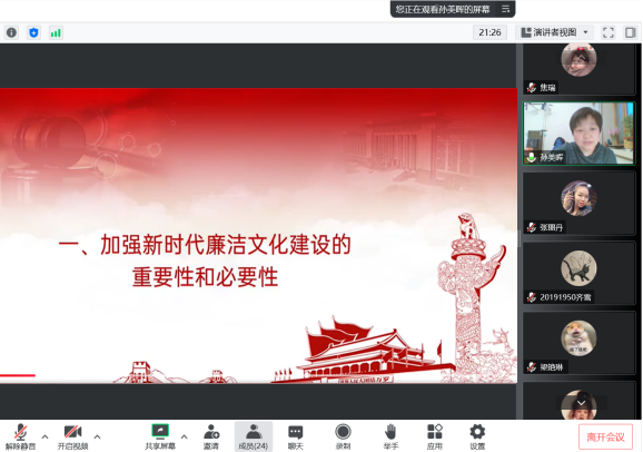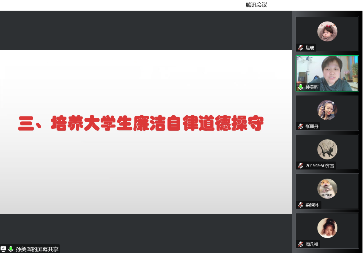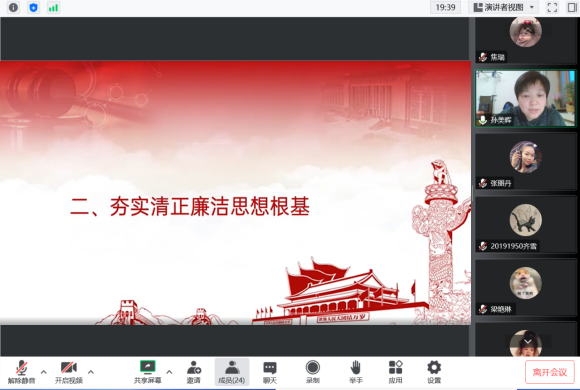 心有所畏,方能行有所止;严以修身,方能严于律己。为扎实推进“能力作风建设年”活动,持续深化传统廉洁文化教育,引导党员坚定理想信念、牢记初心使命,廉洁自律,风清气正,yl6809永利官网集团于2022年12月14日16:00在线上开展廉洁文化教育主题党课。主题党课由yl6809永利官网集团党总支书记孙美晖讲解,yl6809永利官网集团党总支副书记张丽丹主持,yl6809永利官网集团2019级辅导员孙庆斌、2020级辅导员张博伦、2021级2022级辅导员焦瑞参会,学院全体学生党员参会。