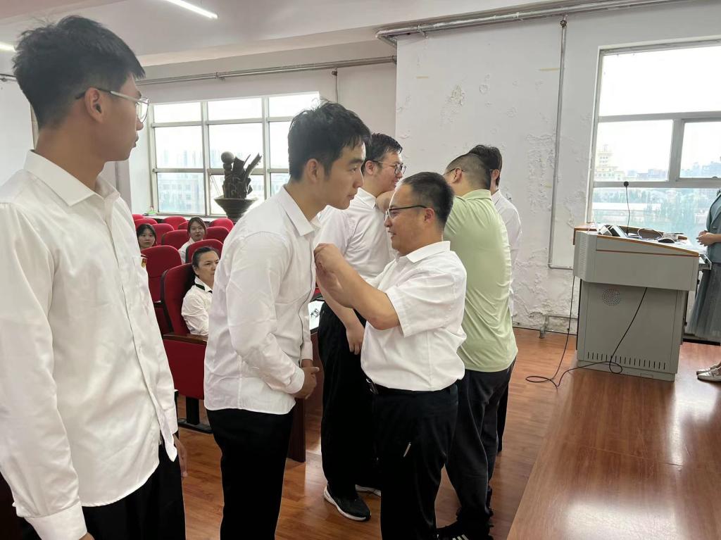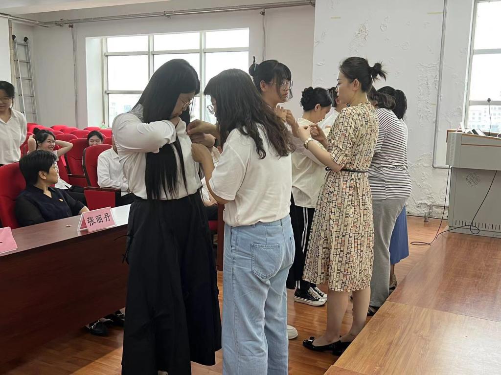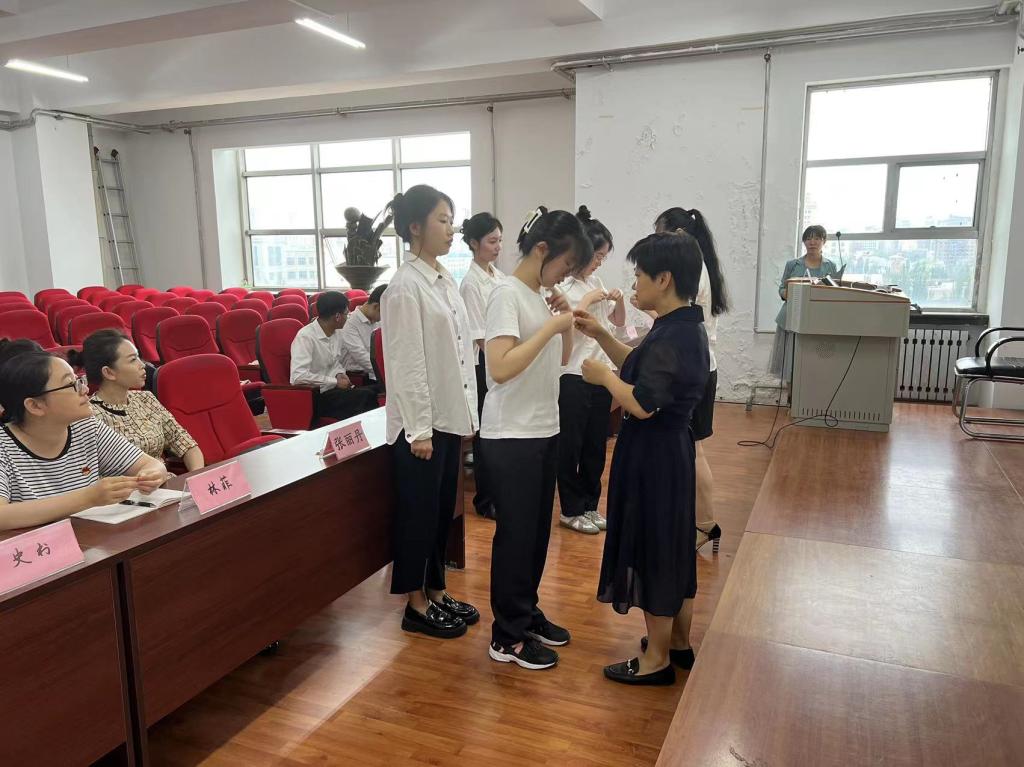 仪式第一项是为新发展的学生党员佩戴党员党徽,学院领导、教师为学生党员亲手佩戴党员党徽的一刻,新发展党员感受学院教师对自己的希冀,更感到自身的责任与义务,党徽在胸前,责任在臂膀,作为学生党员,必定时刻听党话、知党恩、跟党走,不负嘱托与希冀。