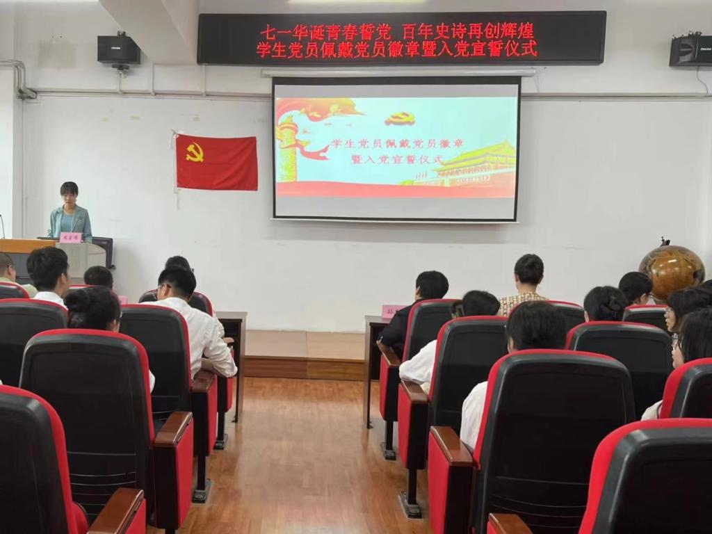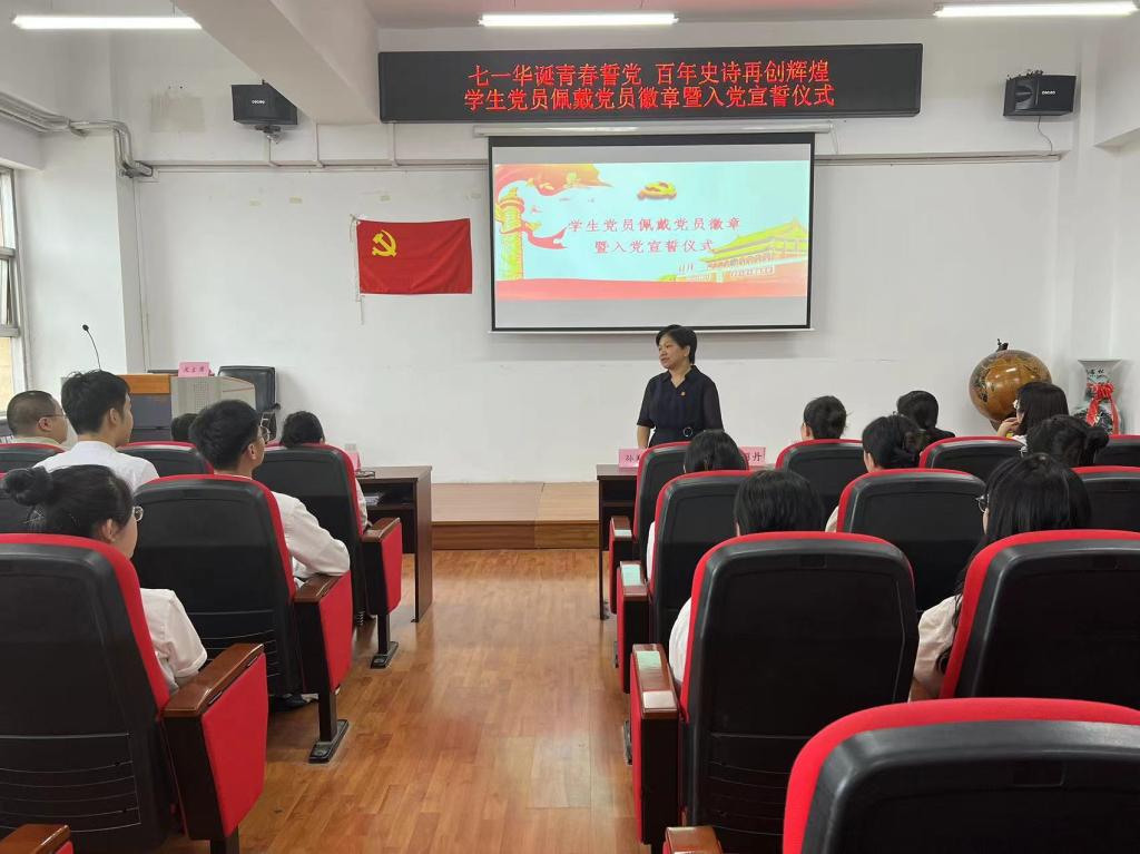 仪式第二项是全体新发展党员宣读入党誓词,全体老党员重温入党誓词。在领誓人魏义霞老师的带领下,全体师生党员面向党旗,举起右手,握拳过肩,庄严宣誓。在铮铮誓言中,用党的光荣传统和优良作风坚定信念、凝聚力量,用党的实践创造和历史经验启迪智慧、砥砺品格。