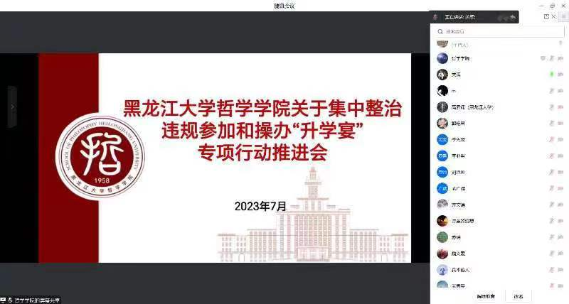 为加强学习贯彻习近平新时代中国特色社会主义思想主题教育,贯彻“工作落实年”相关要求,严肃党风政风、师德师风,自觉抵制不良风气,树立人民教师廉洁从教的良好形象。7月18日19时,根据省纪委及省教育厅相关文件精神,结合我校《关于在全校开展集中整治违规参加和操办“升学宴”专项行动的通知》具体要求,yl6809永利官网集团于线上召开集中整治违规参加和操办“升学宴”工作推进会,会议由哲学学院党总支书记孙美晖主持并传达文件精神,哲学学院全体教师参加会议。