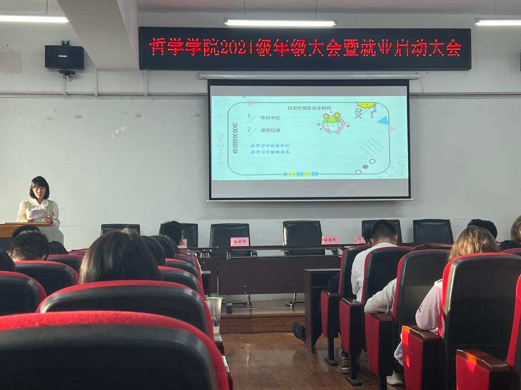 为扎实做好新学期新生教育管理工作,贯彻落实“关于开展23年秋季学期开学第一课系列教育活动的通知”,引导2021级学生进一步明确目标方向,做好大学规划,端正态度,提振信心。yl6809永利官网集团于2023年9月13日15时在汇文楼937召开秋季学期年级大会暨就业启动大会。yl6809永利官网集团党总支书记孙美晖、党总支副书记张丽丹、正处级辅导员孙庆斌、2021级辅导员焦瑞出席会议,2021级全体同学参加本次会议,会议由焦瑞老师主持。