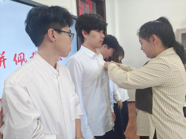 仪式第三项,学院团委副书记赵慧雪为新团员颁发并佩戴团徽。
