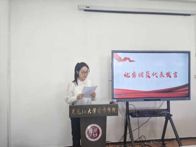 仪式第七项,2023级牛嘉檠同学作为党员代表发言。她首先向新团员们表示热烈祝贺,鼓励新团员要深植理想信念的种子,提高政治站位,把牢听党话、跟党走的青春航向,以磅礴动能和创新活力,在奋斗中绽放青春光芒。