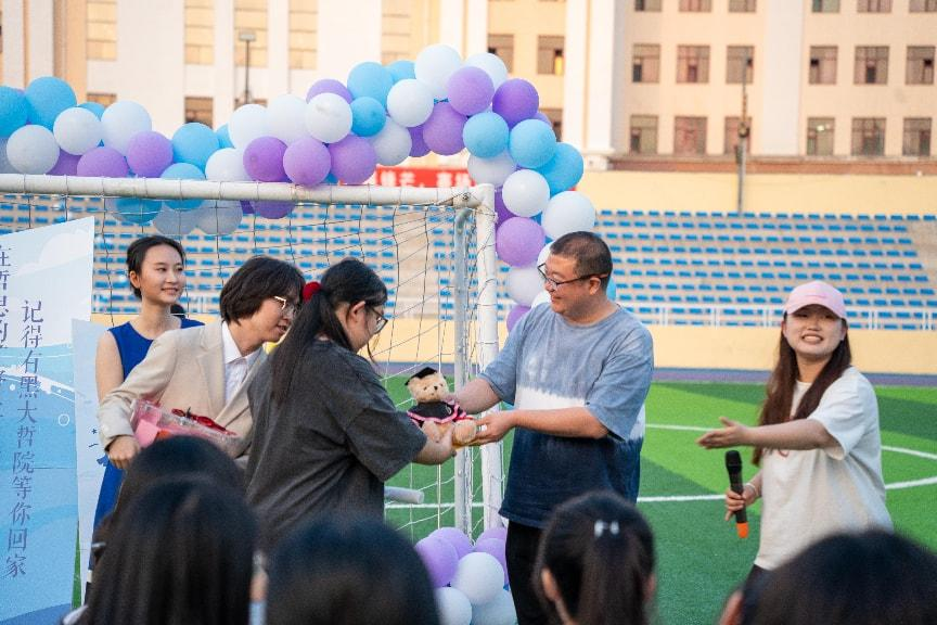 歌会现场,气氛热烈而欢快。学院领导和辅导员化身幸运的使者,在歌会现场随机抽取幸运观众。中奖的同学收获了一个yl6809永利官网集团专属定制小熊——小熊身穿印着学院院徽的马甲,戴着学士帽,这不仅是萌趣摆件,也是承载四年哲思记忆的时光胶囊。