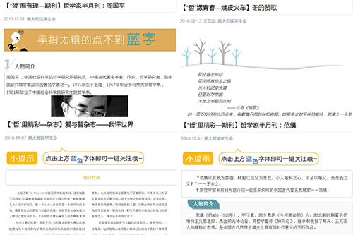 为了营造更加轻松的学习氛围,提高同学们的学习兴趣,让同学们在乐趣中学习,学院充分发挥新媒体在学风建设中的作用。在学生会公众平台上进行《哲学家半月刊》、《每周一点小哲学》、《斓皮火车》、《Fun思哲》等微信趣味推送。通过网络平台这一信息载体,让学习深入到同学们生活的方方面面,提高专业知识学习的吸引力和感染力。