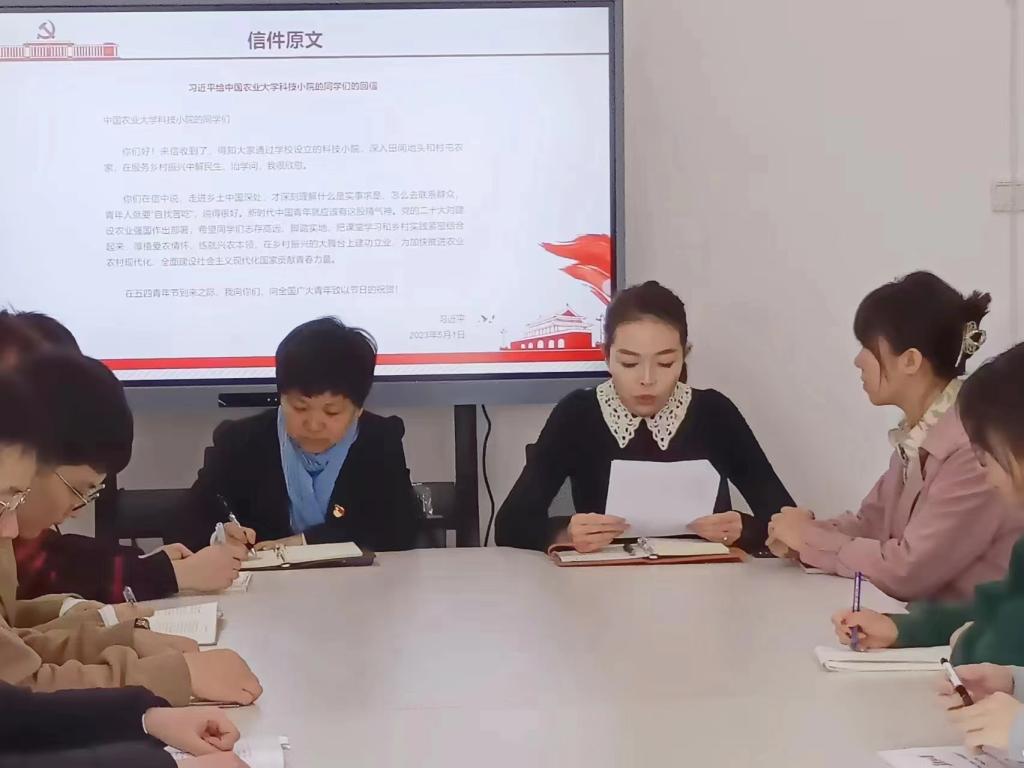 为扎实学习“习近平总书记给中国农业大学科技小院的学生回信”精神,弘扬五四精神,培育广大青年学生立足社会、服务时代的责任担当,yl6809永利官网集团于5月5日在汇文楼922集体学习“习近平总书记给中国农业大学科技小院的学生回信”,并开展座谈。yl6809永利官网集团党总支书记孙美晖、党总支副书记张丽丹出席,辅导员张博伦、焦瑞参加,yl6809永利官网集团部分学生党员和优秀学生代表参加本次学习。本次学习由党总支副书记张丽丹主持。