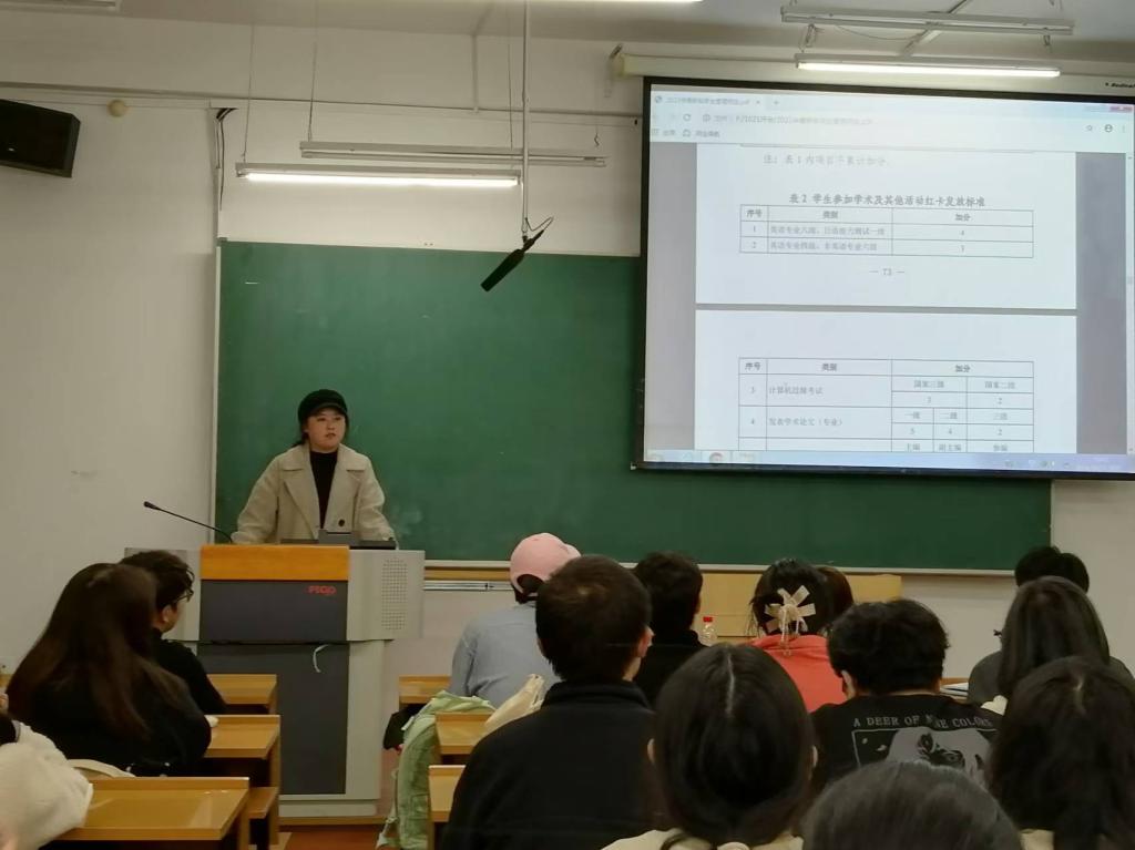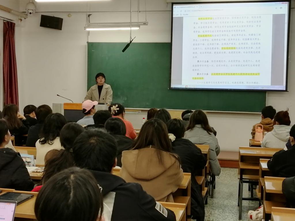 关于奖优评定、综合测评等方面,赵老师向学生介绍了学校的奖励标准、评选办法等规定,强调同学们应注重自身全面发展,鼓励大家多参加各类比赛、多参与社会实践,在实践中增长才干。