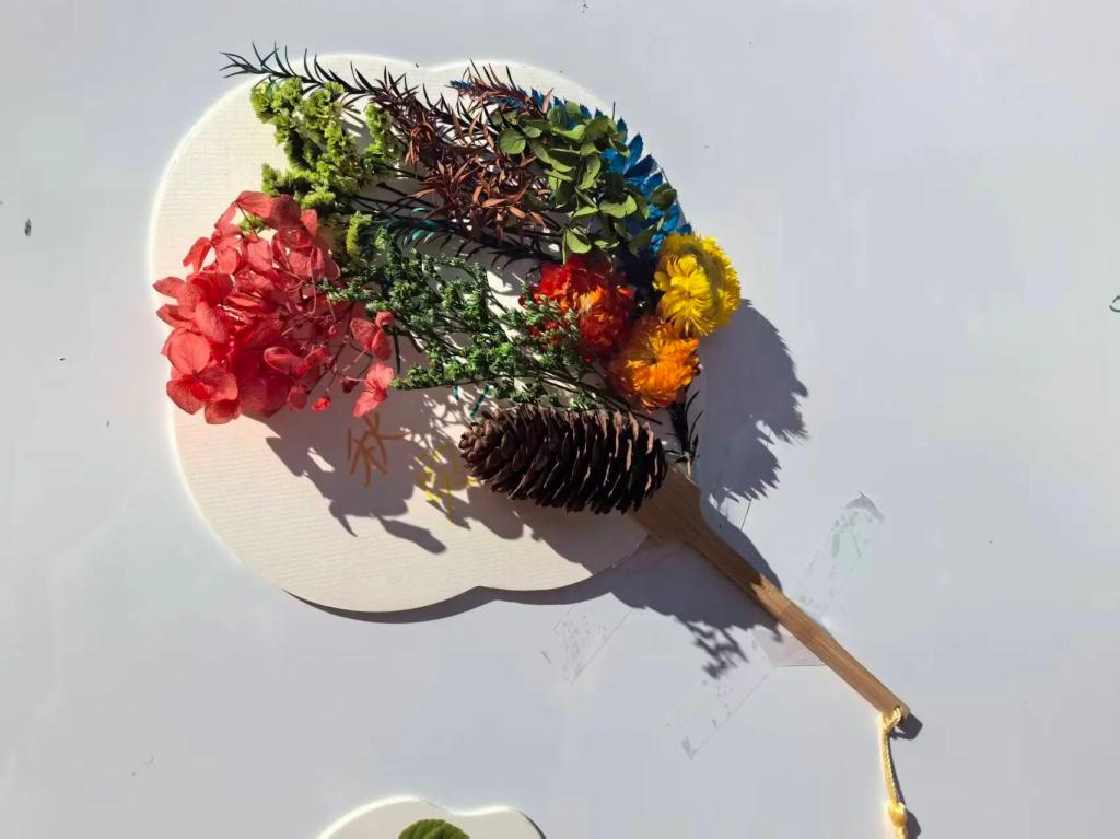 活动一:在“扇面心旅”上勾勒心绪:本次活动在于将自然之美与传统之韵完美融合。同学们收集校园内飘落的秋叶,将其创意拼贴于素净的扇面之上。一柄柄团扇,因树叶天然的形态与色彩而被赋予全新的生命,或构成写意的秋景,或拼成抽象的心绪。这不仅是自然的艺术升华,更是内心在方寸之间的诗意栖居。同学们在自然与文化的交融中,完成了一次与自我、与传统的深度对话。