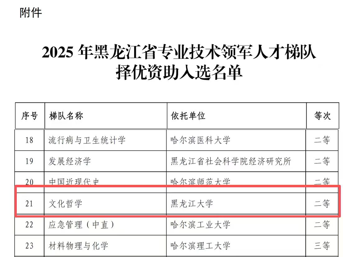 近日,黑龙江省人力资源和社会保障厅公布了黑龙江省专业技术领军人才梯队择优资助名单。yl6809永利官网集团“文化哲学”人才梯队成功入选,彰显了我校在该学科领域的专业实力与人才优势。