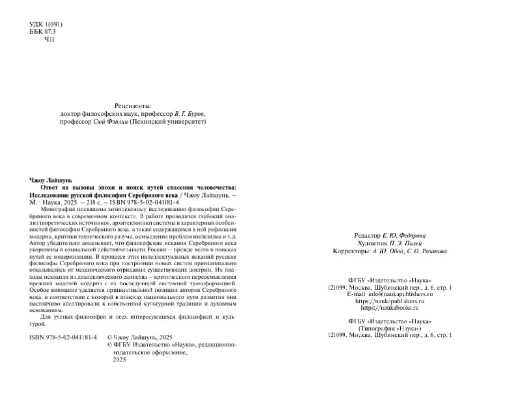 我院教师周来顺教授在俄罗斯科学出版社(Издательство «Наука»)出版俄文学术专著《时代问题的回应与人类出路的探寻——俄国白银时代哲学研究(Ответнавызовыэпохиипоискпутейспасениячеловечества——исследованиерусскойфилософииСеребряноговека)》。该社始创于1727年,在俄罗斯享有很高声誉,是俄罗斯最悠久和规模最大的学术出版机构,同时也是俄罗斯科学院所属重要学术刊物的唯一出版发行单位,以及当今世界影响最大的学术出版机构之一。在近三百年的发展历程中,该社编辑出版了多部产生深远历史影响的系列丛书,以及反映俄罗斯科学技术与社会发展水平的近200种学术性期刊。该社以学术性、严谨性、历史性著称,对促进俄罗斯现代科学发展与思想文化传播发挥了不可替代的作用。