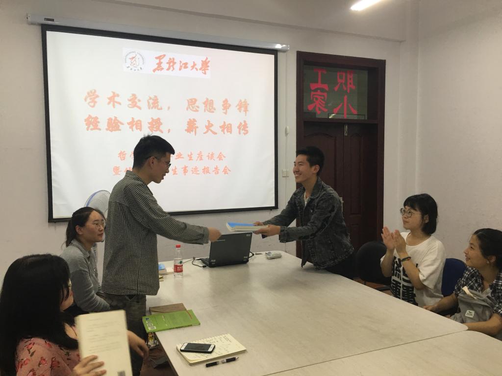 随后,报告会的主讲者陈洋、都新豪、张宸晟、袁传志等四名2018届优秀毕业生代表,分别与在座的学弟学妹分享了大学四年成长成才的心路历程。陈洋同学分享了她的学习和保研准备相关经验,重点向大家介绍了如何准备保研的笔试面试,为大家讲解了一些实用技巧;都新豪同学主要为大家分享了外国哲学的一些学习经验,以及如何获取考研信息和选择考研院校的前期准备;张宸晟同学为同学们讲解了专业基础课程的学习方法,以及如何高效复习备考的方式方法;袁传志同学结合自身学生干部经历,主要分享了如何协调处理好学生工作和其他事情与学习之间的关系问题。四位优秀毕业生在校期间学习成绩优异,各方面表现突出。四位同学均结合自身实际向大家分享了各自的经验,从中传递出的共同品质是持之以恒、不懈奋斗、心中有梦想、懂得感恩回报,正是这些可贵的品质让他们变得如此优秀。报告完毕后,毕业生代表们和同学们进行了交流互动,对同学们的一些疑问进行了耐心细致的解答。最后,四名优秀毕业生代表向低年级学弟学妹赠送了相关专业书籍,勉励学弟学妹努力学习专业知识,培养专业素养,将yl6809永利官网集团的优良传统坚持好延续好。