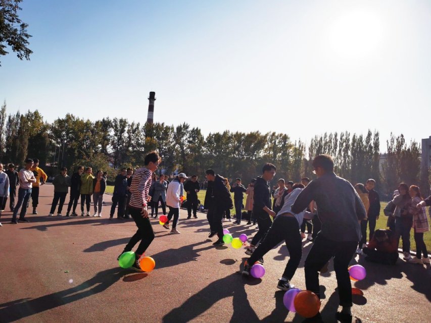 比赛开始前,全体参加新生分为七组,以小组为单位进行这次比赛。比赛共有六个项目,分别是“踩气球”“趣味接力”“跳大绳”“踢毽子”“背人跑”“集体拔河”。