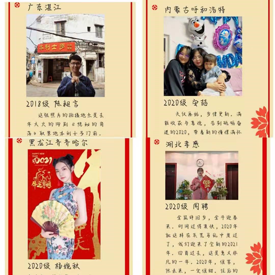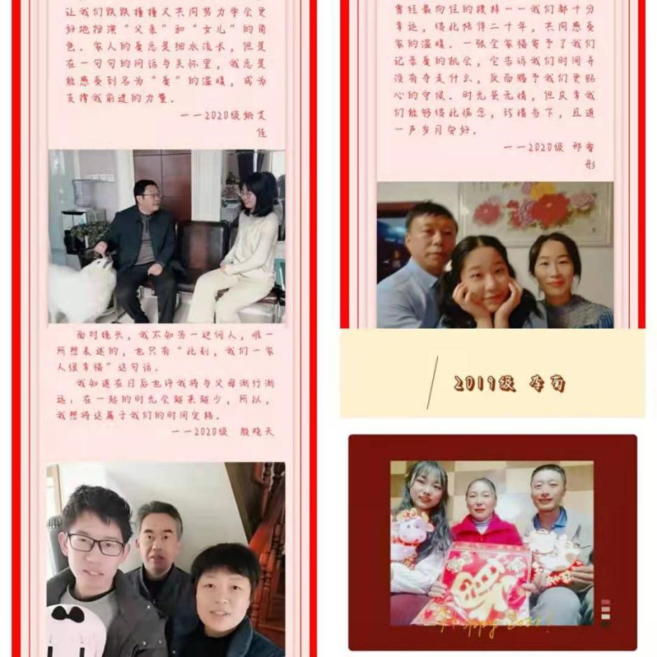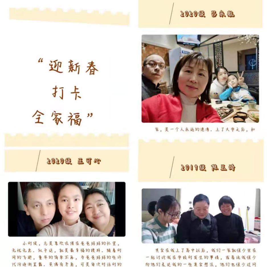 结合“打卡一张全家福”的要求,yl6809永利官网集团开展“迎新春打卡全家福”主题活动,在居家时光中记录与父母的温馨时刻,鼓励学生和父母讲讲在学校的故事,讨论一下个人的规划与发展,把自己的真实想法与父母进行交流,在与父母的温暖沟通中增进家庭感情。