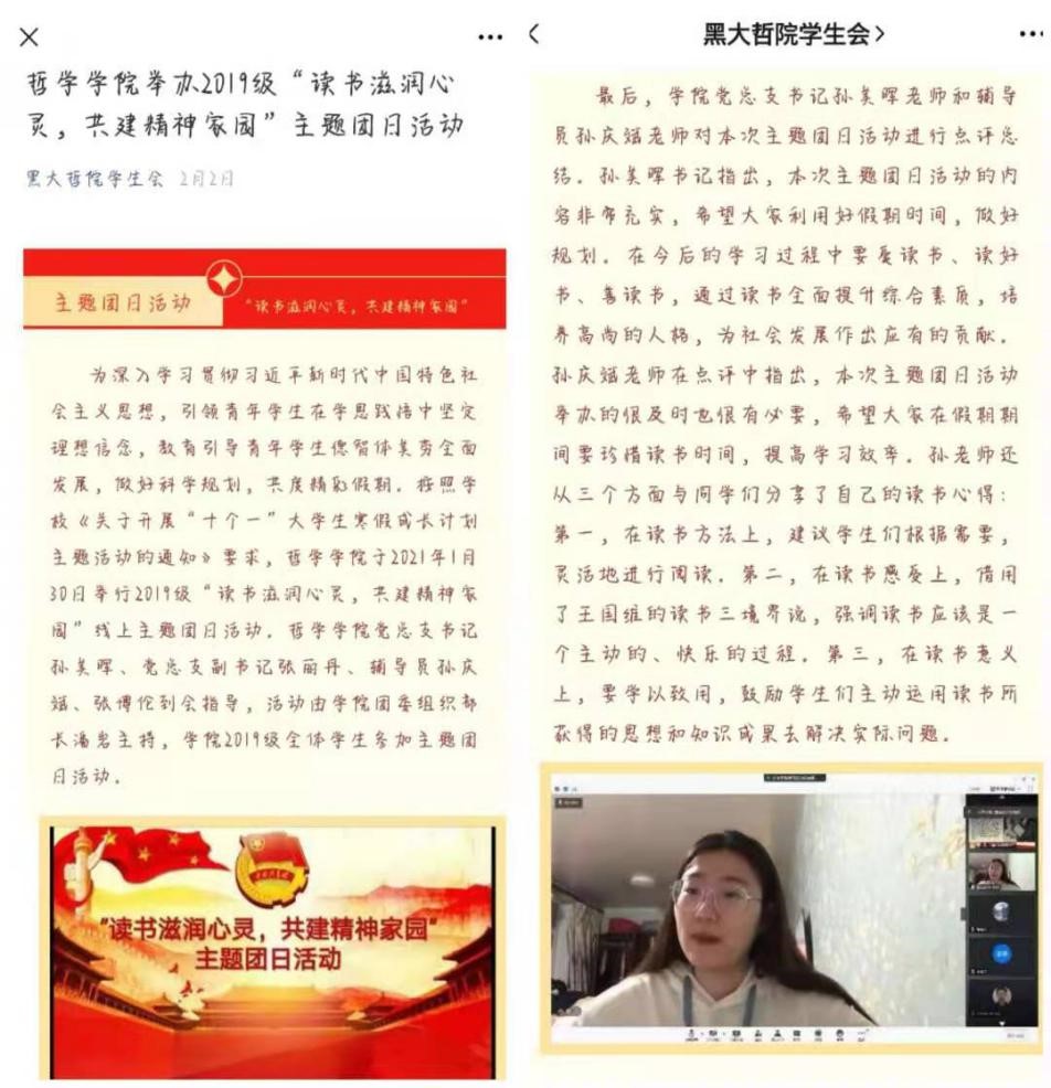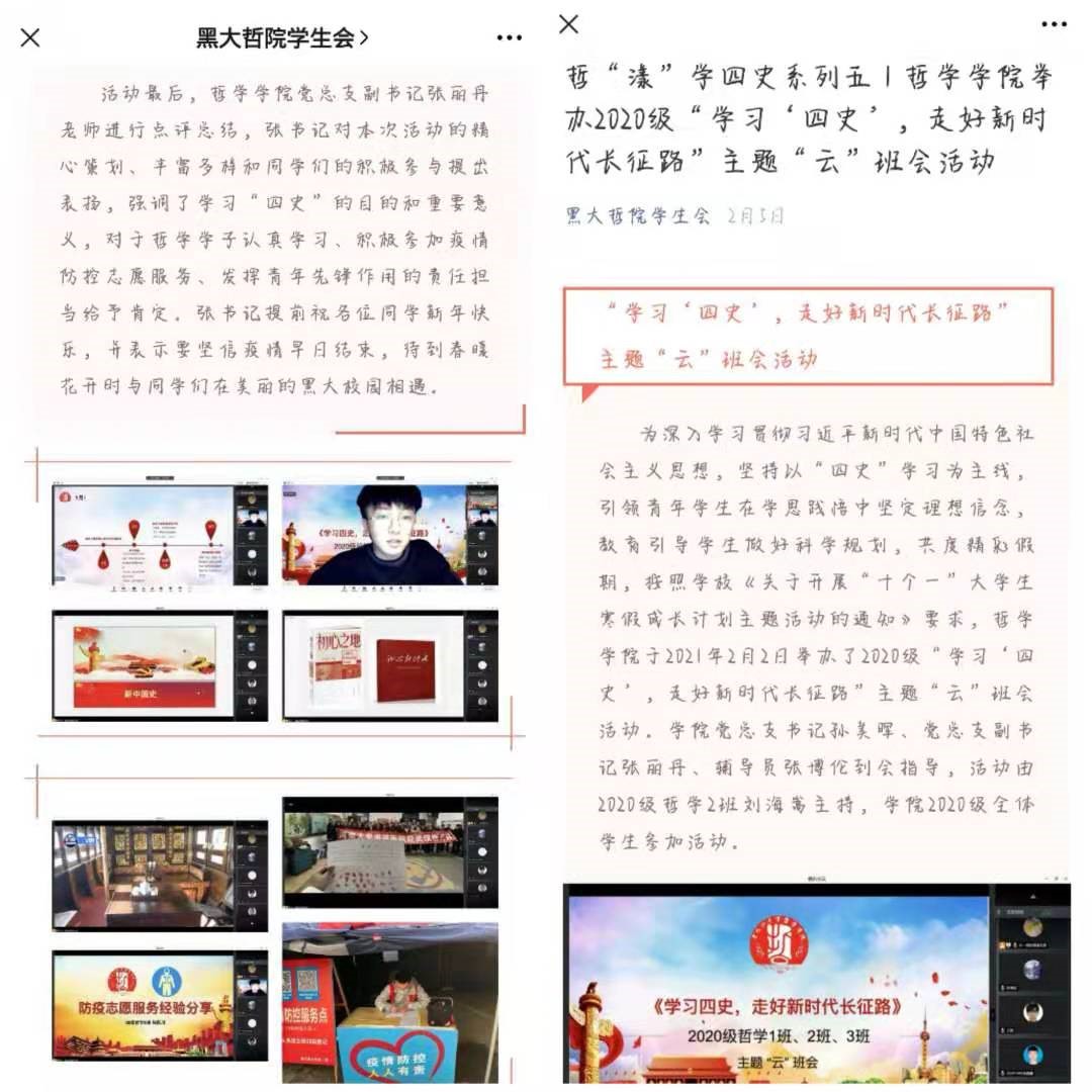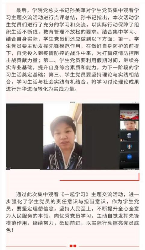 结合“打卡一次‘云班会’活动”,yl6809永利官网集团各年级班级分别召开“学习‘四史’,走好新时代长征路”和“读书浸润心灵、共建精神家园”主题云班会活动,结合四史学习以及读书等主题,总结2020年度班级、个人的收获与成长,制定交流个人与班级在学业发展、创新创业、社会实践等方面的规划与目标,畅谈下一阶段的目标与成长发展计划。学院还组织学生党员举行了集中观看《一起学习》主题交流活动,趁热打铁巩固理论学习效果,促进学生以科学理论武装头脑,将学习与实践有机结合起来。