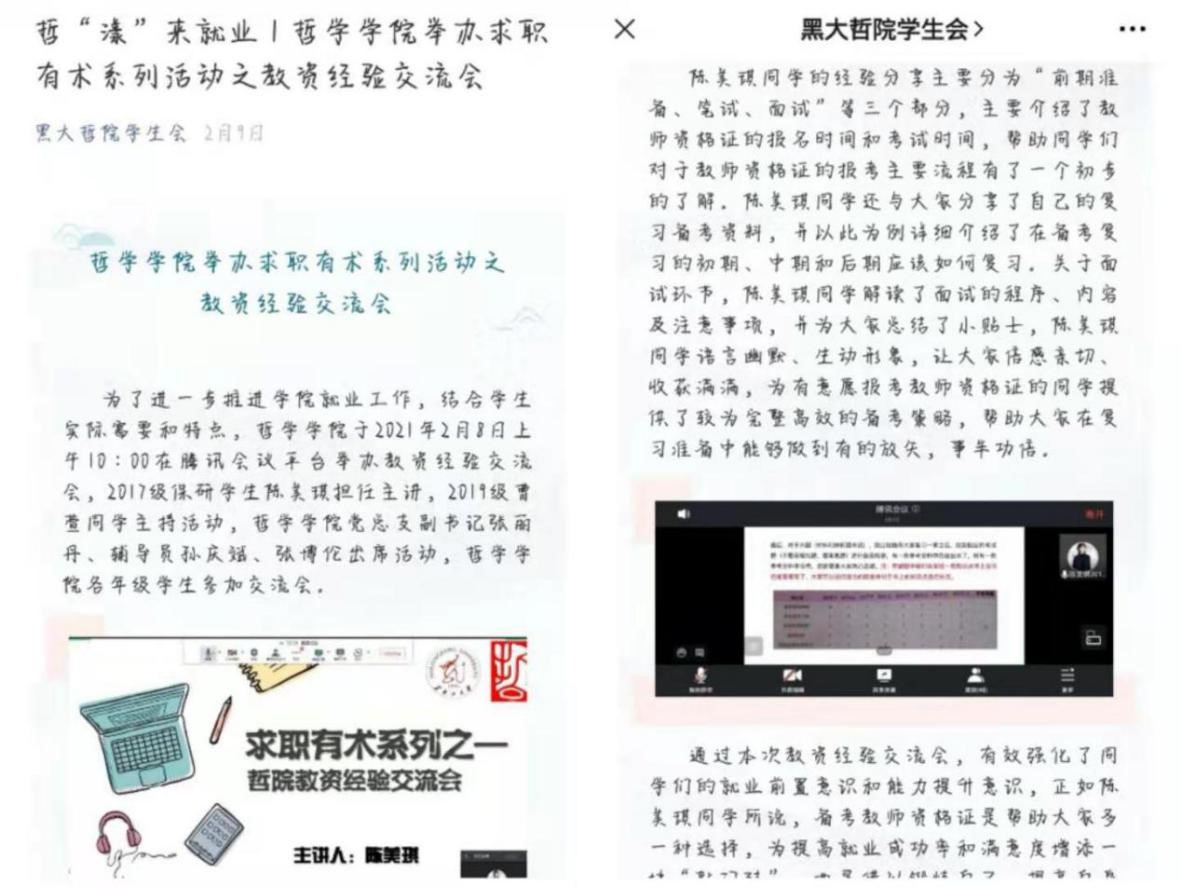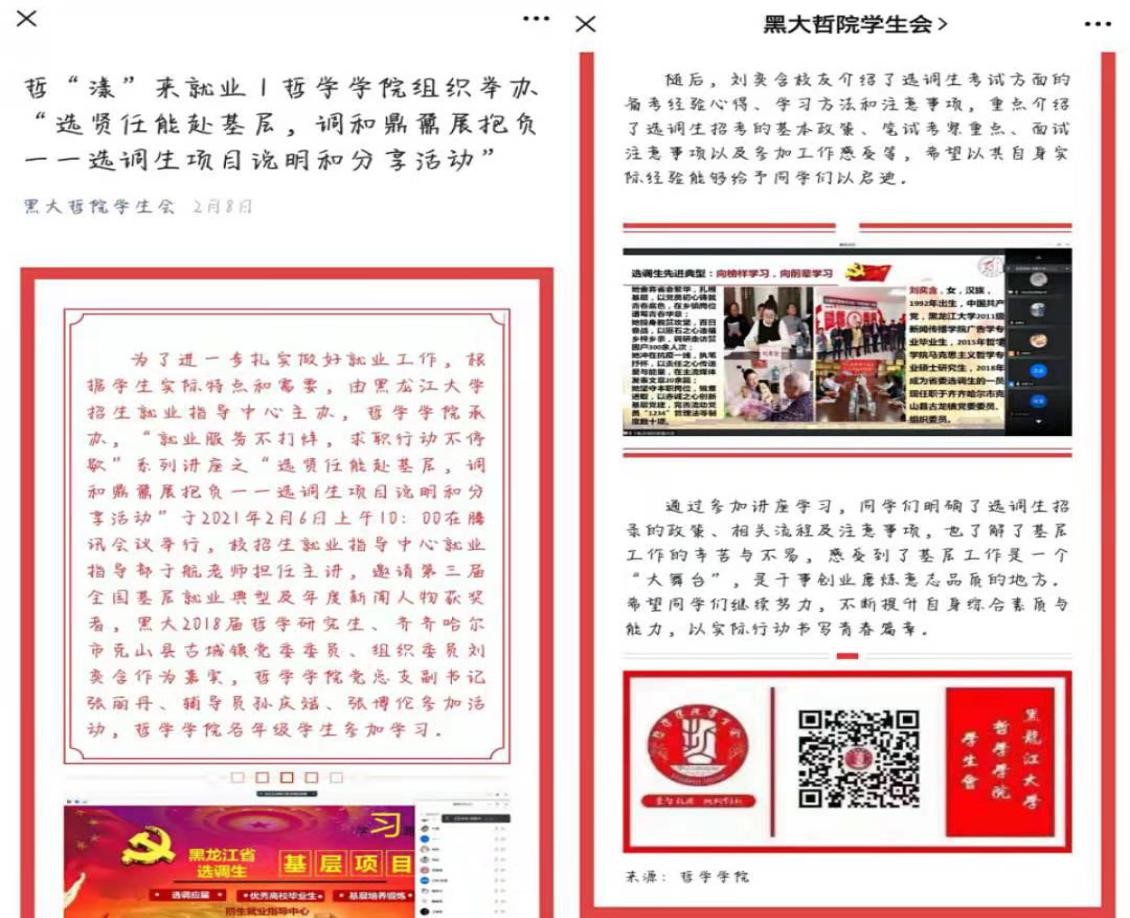 结合“打卡一次‘校友云访谈’”,yl6809永利官网集团结合就业工作实际,特别邀请社会各界优秀校友,开展“选贤任能赴基层,调和鼎鼐展抱负——选调生项目说明和分享活动”、“‘就业服务不打烊,求职行动不停歇’系列之《90分钟打造HR目不转睛的简历》讲座”、“求职有术系列活动之教资经验交流会”、“基层就业项目介绍”等系列就业交流活动,开启“校友云访谈”,在线上与他们进行一次深入的沟通交流,开展线上访谈行动,并撰写访谈心得体会,听一听“过来人”的建议,聆听暖心的黑大故事,感受黑大人的成长与情怀。
