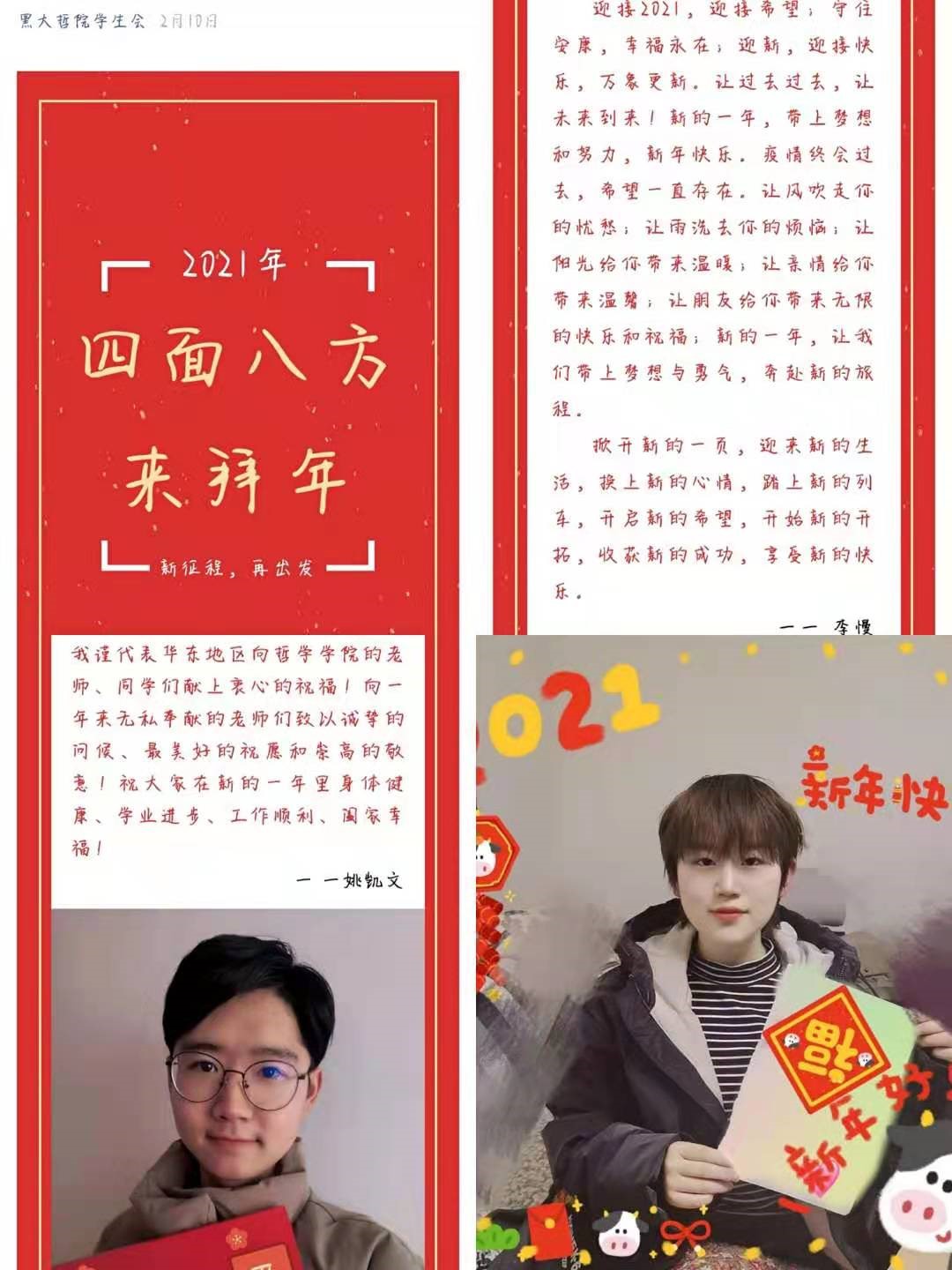 按照“打卡一个家乡特色文化”的要求,yl6809永利官网集团开展“我的家乡我宣传”、“打卡家乡特色美食特辑”、“哲学学子‘四面八方来拜年’特辑”、春联文案及作品征集等主题征集活动,收集展示家乡的生活照、风景照等作品,用发现美的眼睛探寻家乡特色文化,激发学生对祖国河山的热爱,激发学生热爱家乡情怀,以实际行动做家乡文化的传播者和宣传员,为家乡献上新春贺礼。
