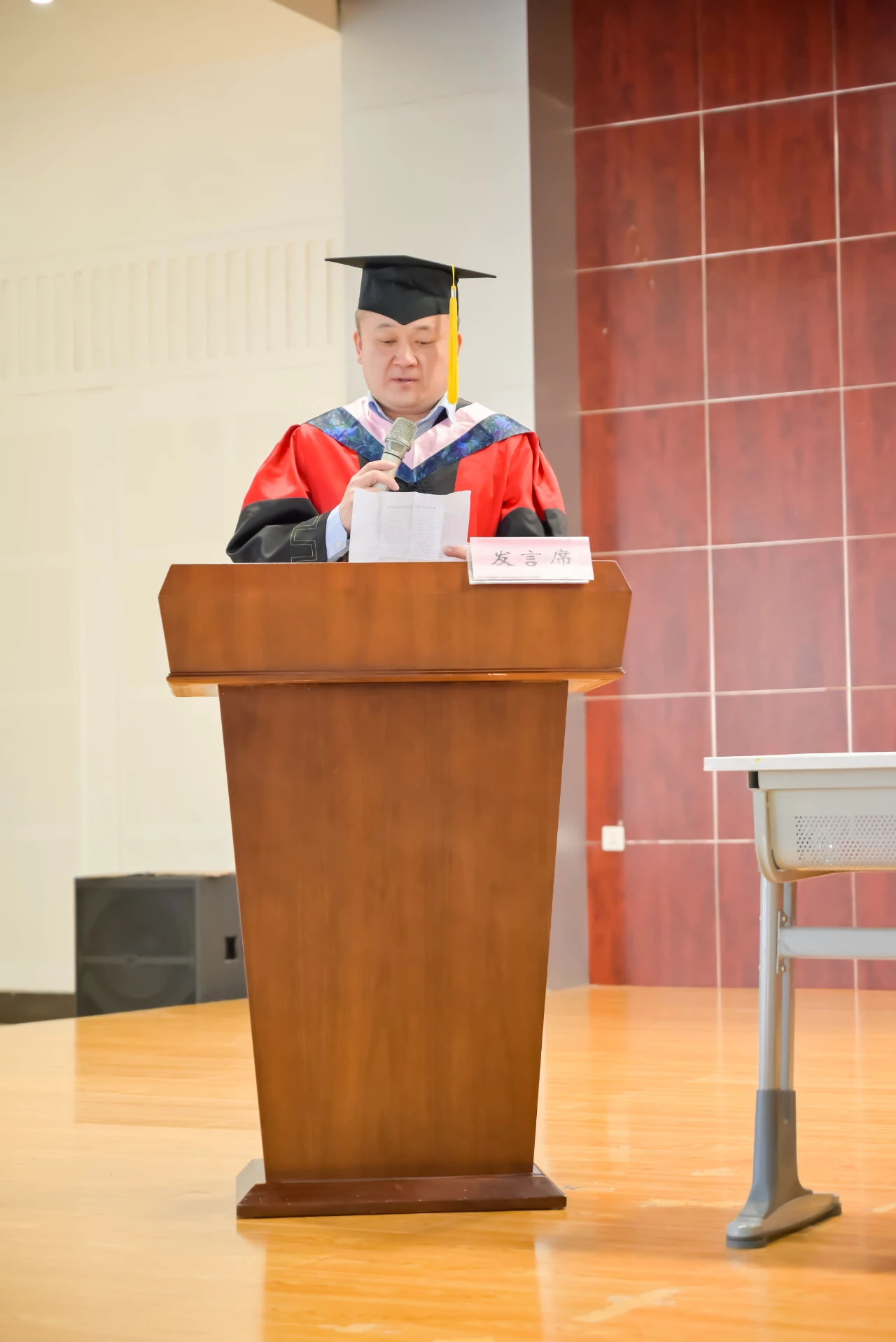 典礼第二项,副院长周来顺宣读了毕业资格审查报告、学位审批报告。yl6809永利官网集团2017级毕业生共75名,符合授予毕业证书、学位证书条件的75名。经研究决定,授予李蕊等75名同学毕业证书,并授学士学位。