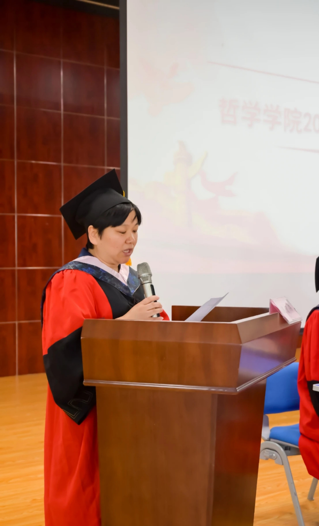 典礼第六项,校友代表2004届哲学专业毕业生、哈尔滨商业大学马克思主义学院副院长郑秋月教授发言。