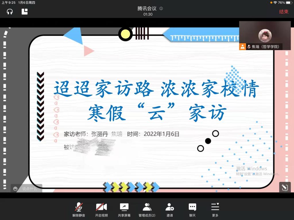 在“云”家访中,张丽丹副书记与学生家长进行真诚细致的交流,对学生家庭情况、经济收入和支出进行深入了解,并向家长们讲解国家、社会、学校的资助政策,指导学生努力方向,希望可以切实帮助学生缓解经济压力。三位辅导员老师也分别向家长们介绍学生在校表现、学习成绩、现存问题和受资助等情况,并且向家长详细讲解了生源地助学贷款、校园地助学贷款、助学金以及社会和校友资助基金。