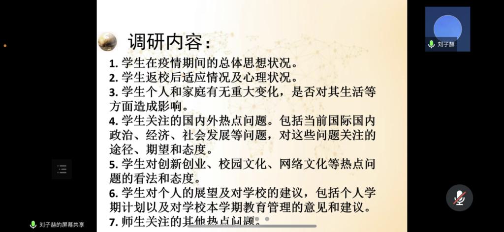 会议围绕“学生在疫情期间的总体思想状况”、“学生关注的国内外热点问题”、“在校学习的感受或困惑”“对学生工作的建议”以及“学生个人展望”等话题进行。在会议中,各年级辅导员与学生充分交流、互换想法,同学们纷纷表达自身想法,时刻关注疫情态势并能积极配合学校在疫情防控工作中的各项安排,同时懂得自我排解焦虑情绪;部分同学分享了自己在封校期间成为疫情防控志愿者的经历,彰显抗击疫情的乐观心态与来自青年人身上的昂扬朝气,在学校学院以及辅导员老师帮助下,同学们对抗击疫情充满信心,总体上心理与思想状态良好。