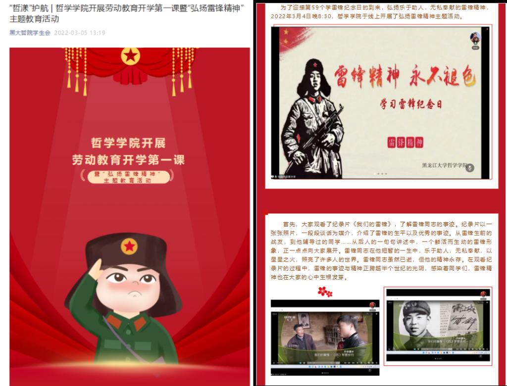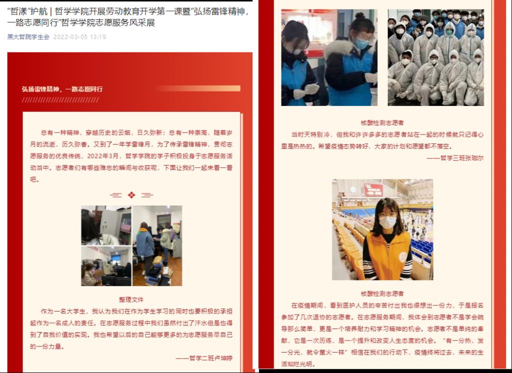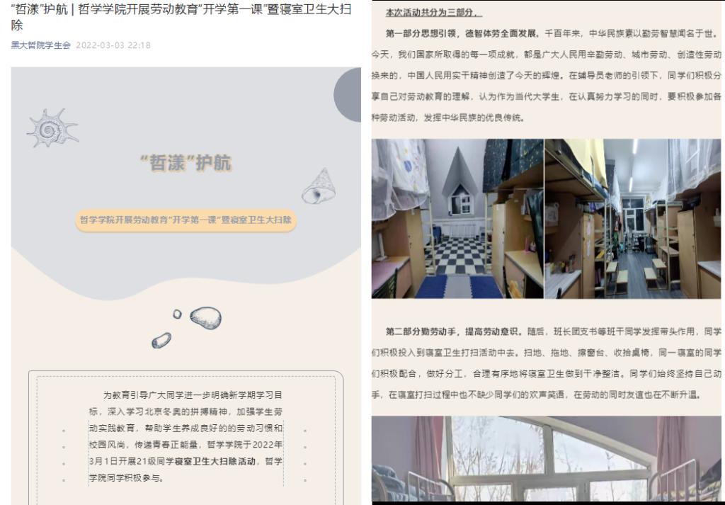 春种一粒粟,秋收万颗子。学院以劳动教育为主题,开展了3场劳动教育活动,分别为开学第一课暨“弘扬雷锋精神”主题教育活动、“弘扬雷锋精神,一路志愿同行”yl6809永利官网集团志愿服务活动以及寝室卫生大扫除活动。为了迎接第59个学雷锋纪念日的到来,弘扬乐于助人,无私奉献的雷锋精神,2022年3月4日,yl6809永利官网集团于线上开展了弘扬雷锋精神主题活动,yl6809永利官网集团学生志愿者们通过参与疫情防控志愿活动,并发表志愿感想。同时,按照疫情防控要求,在保证安全的情况下,为加强学生劳动实践教育,帮助学生养成良好的的劳动习惯和校园风尚,学院开展21级同学寝室卫生大扫除活动,学院同学们积极参与。