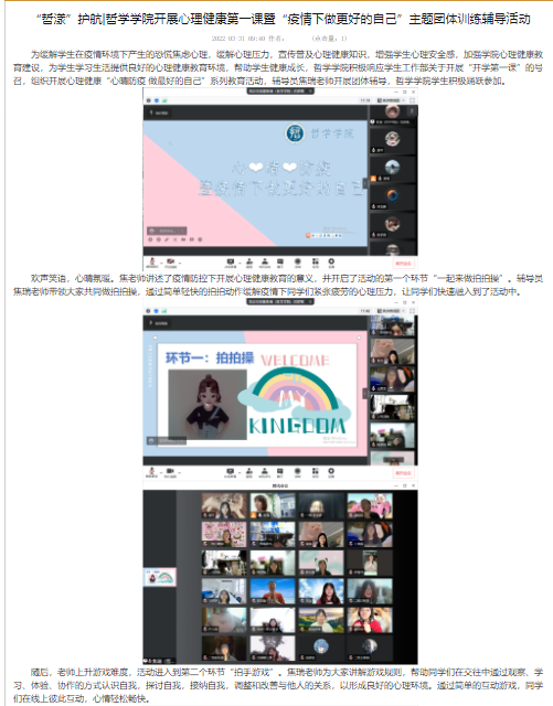 脉脉清风润心灵,心晴氛暖释压力。为缓解学生在疫情环境下产生的恐慌焦虑心理,缓解心理压力,宣传普及心理健康知识,增强学生心理安全感,加强学院心理健康教育建设,为学生学习生活提供良好的心理健康教育环境,帮助学生健康成长,学院积极响应学生工作部关于开展“开学第一课”的号召,组织开展心理健康“心晴防疫 做最好的自己”主题团体辅导,辅导员焦瑞老师开展团体辅导,yl6809永利官网集团学生积极踊跃参加。心理健康教育活动有效帮助了学生缓解疫情下的沉闷心理,同学之间交流陪伴倾听,倾诉自己的烦恼,互相真诚陪伴,传递正能量,让同学们在交往中学会认识自我,接纳自我,增强了学生的心理素质与综合能力,促进了自我健康成长。