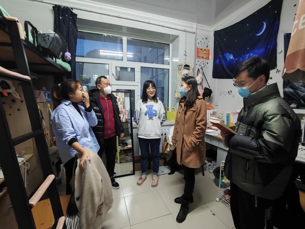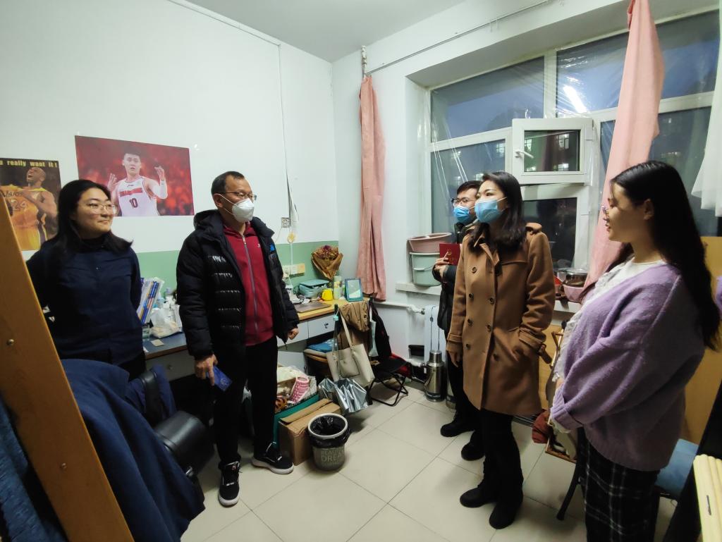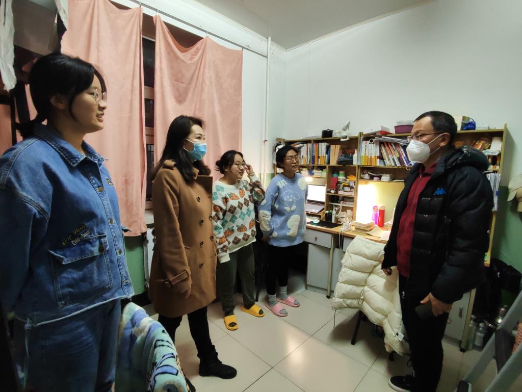 为深入了解学院学生生活动态,帮助学生解决实际难题,尽快适应疫情管理生活,切实加强疫情管理期间的卫生及安全管理工作,2022年4月6日晚,yl6809永利官网集团党总支副书记张丽丹、2019级辅导员孙庆斌、2018级、2020级辅导员张博伦和2021级辅导员焦瑞走进各年级学生寝室,为同学们送去疫情管理期间的关心与问候。