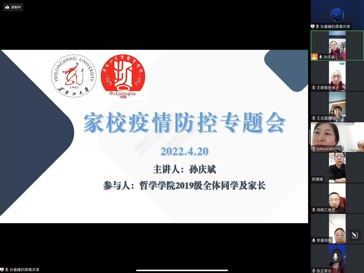 2022年4月20日晚,yl6809永利官网集团2019级全体学生、家长与辅导员孙庆斌老师班主任利用腾讯会议平台,开展了家校疫情防控专题会。本次家校疫情防控专题会旨在教育引导学生遵守防疫相关规定,吁请家长做好学生的引导,帮助学生调节情绪,养成良好的行为习惯。