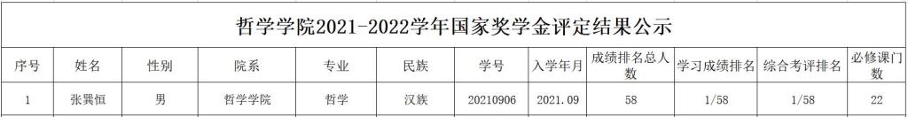 根据我校《学生工作部:关于评定2021-2022学年国家奖学金的通知》要求,经学院奖助学金评审小组审核,现将哲学学院2021-2022学年国家奖学金评定结果公示如下,公示期为2022年10月3日-2022年10月7日(五个工作日)。