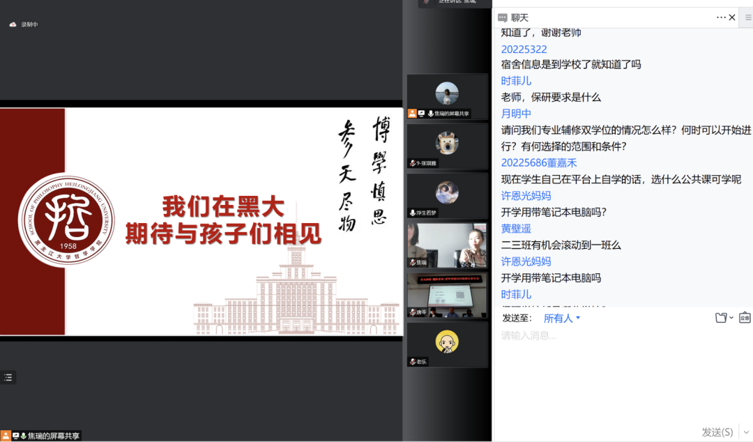 凝心聚力乘风起,奋起扬帆破浪行。此次线上座谈会切实有效地解决了新生家长的疑问,帮助新生对大学生活做好思想与行动上的准备,为促进师生交流、家校互联打下基础,有效开启了家校协同育人的教育模式。希望2022级新生们,在黑大这片土地上,求科学之真、修人文之善,修学储能,塑造品格,不负青春、不负韶华、不负时代。