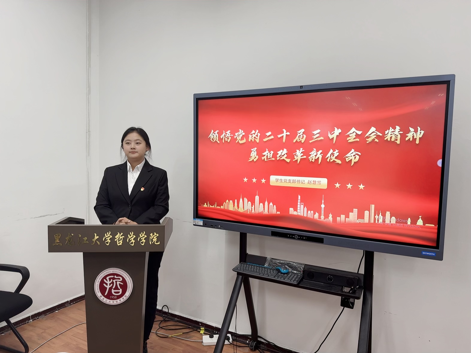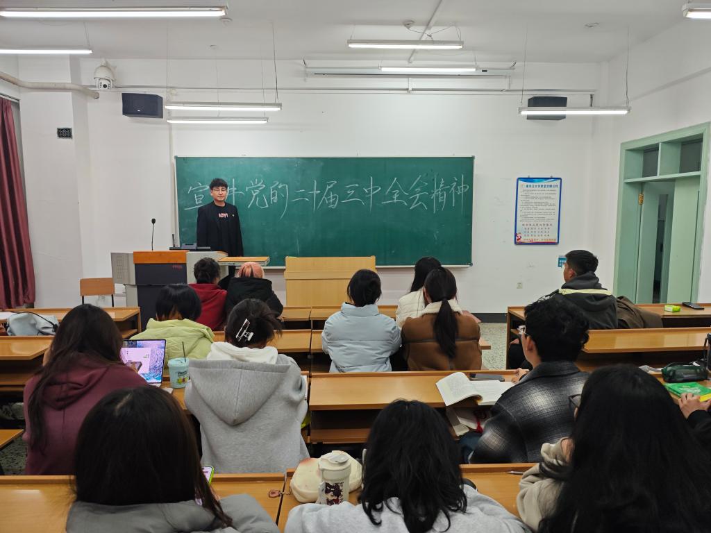 10月14日,学生党支部书记赵慧雪于汇文楼921以《领悟党的二十届三中全会精神 勇担改革新使命》为题进行宣讲,她指出学生党员作为青年学生中的先进分子,要刻苦钻研不断提升自己的专业素养,发挥模范带头作用,为强校发展贡献“哲漾”学子的力量。