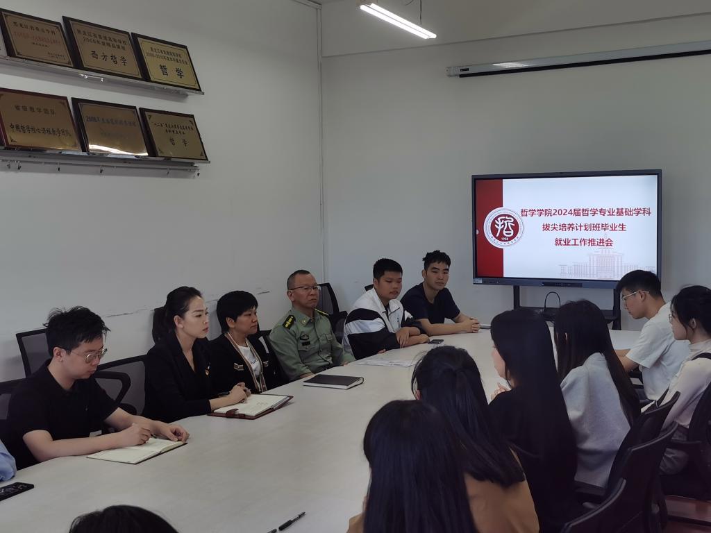 为进一步落实国家“稳就业”“保就业”的决策部署,持续推进学院2024届毕业生就业工作落地落靠,yl6809永利官网集团于2023年9月15日上午在汇文楼922会议室召开2024届哲学专业基础学科拔尖培养计划班毕业生就业工作推进会议,学院党总支书记孙美晖、党总支副书记张丽丹、正处级辅导员孙庆斌、2024届辅导员张博伦以及2024届哲学专业基础学科拔尖培养计划班全体学生参加大会。